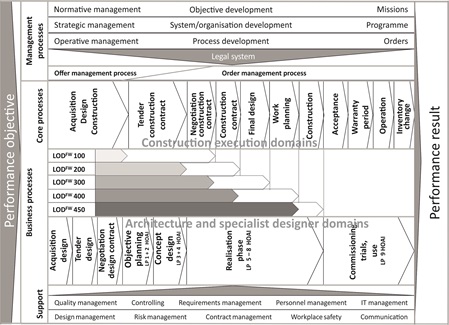 The discipline model in the published guidelines complies with the standards of buildingSMART for Information Delivery Manual (IDM) status. It integrates the traditional process structures of construction companies and has been structured in five levels of development, which are referred to as Level of Development Formwork Technologies LODFW, LODFW 100 to LODFW 450. The individual LODFW documents are integrated dynamically into the different construction project phases, which means that project-specific agreements about the flows of data and information are recommended to be drawn up between the project participants.